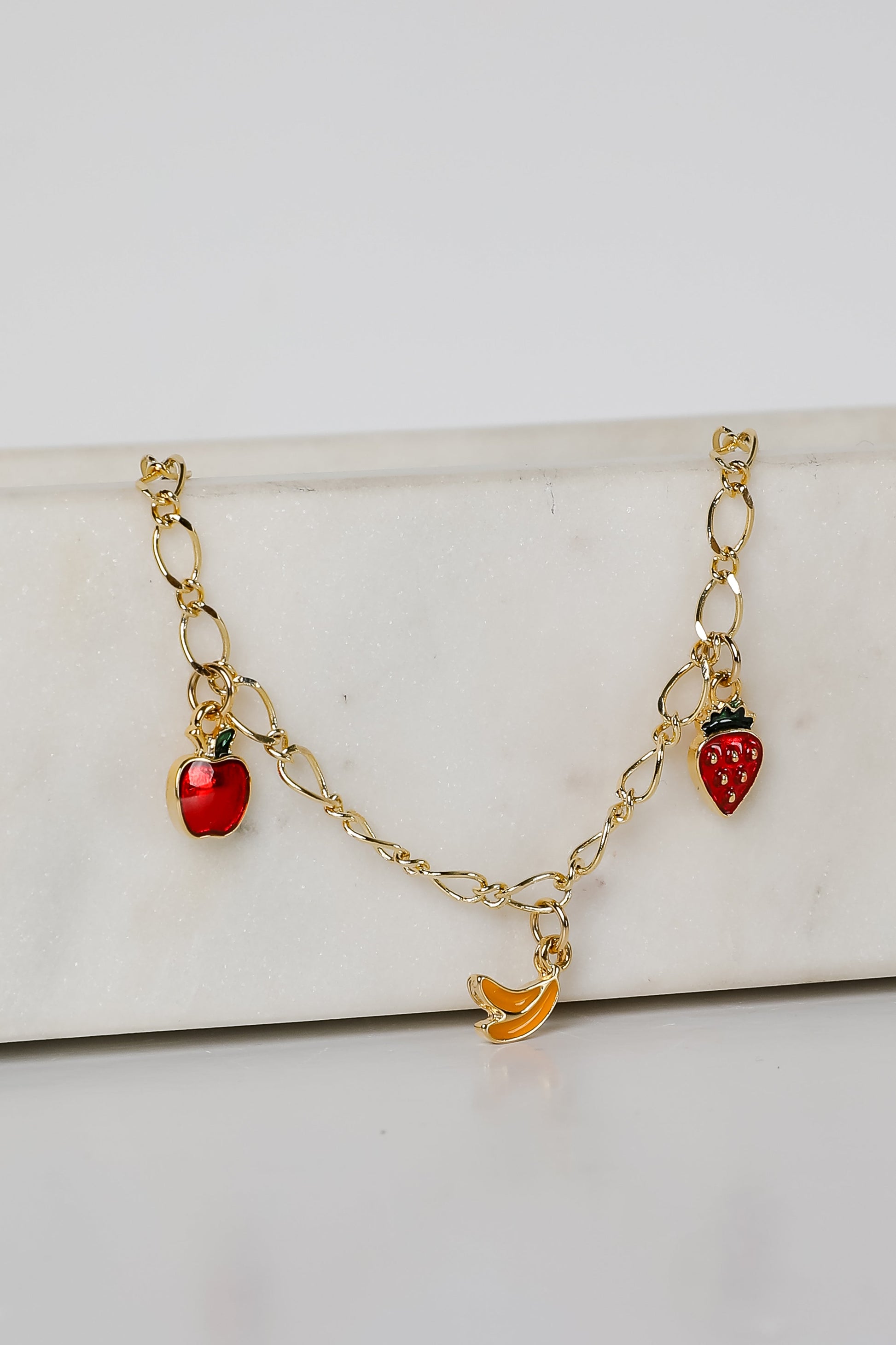 You'll definitely create the cutest looks all season long with the Aurora Gold Fruit Charm Bracelet! This cute bracelet is made of a gold chain with fruit charms & a lobster clasp + extender! Wear it on its own or stacked with other bracelets to instantly upgrade your look!