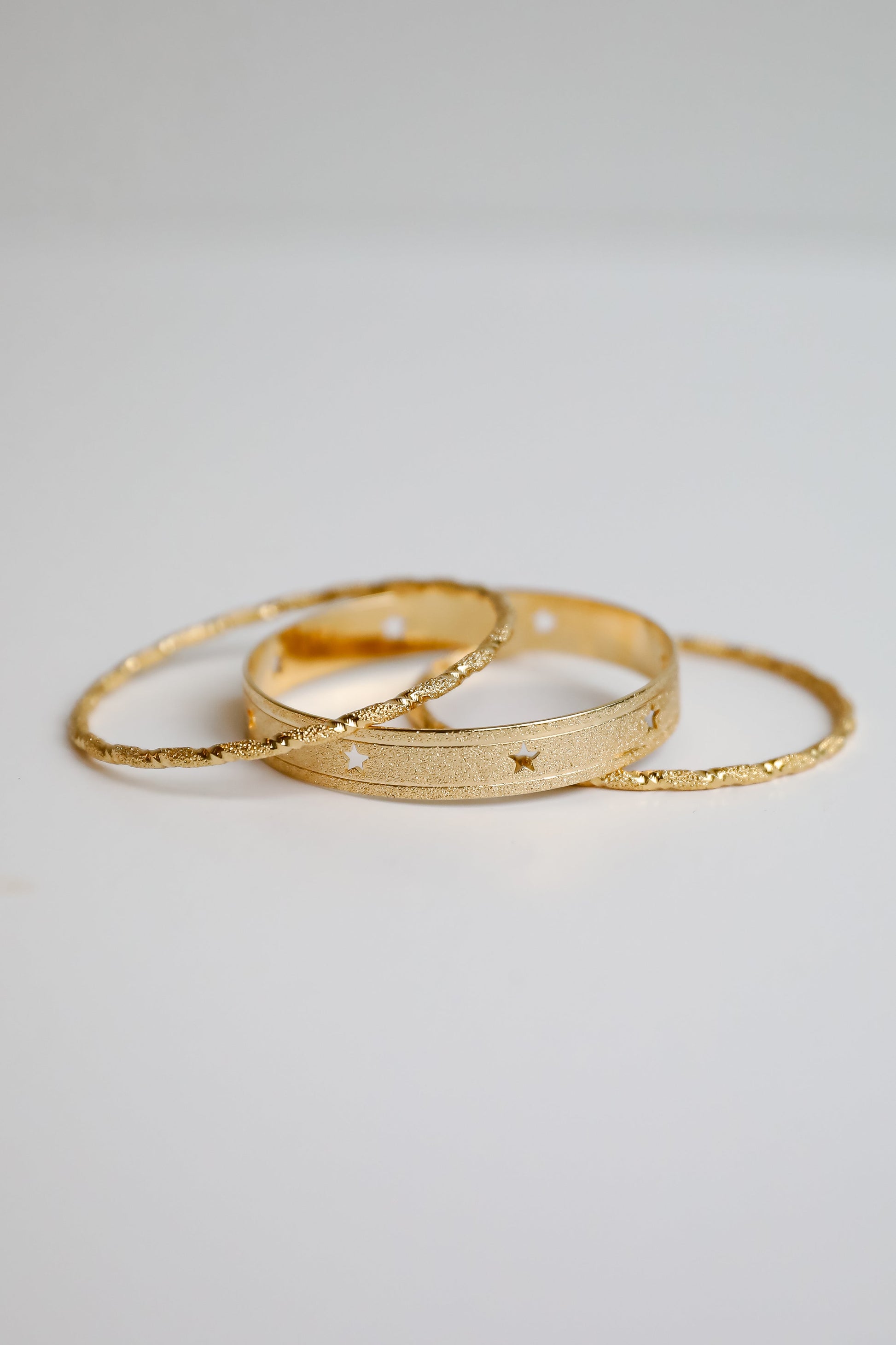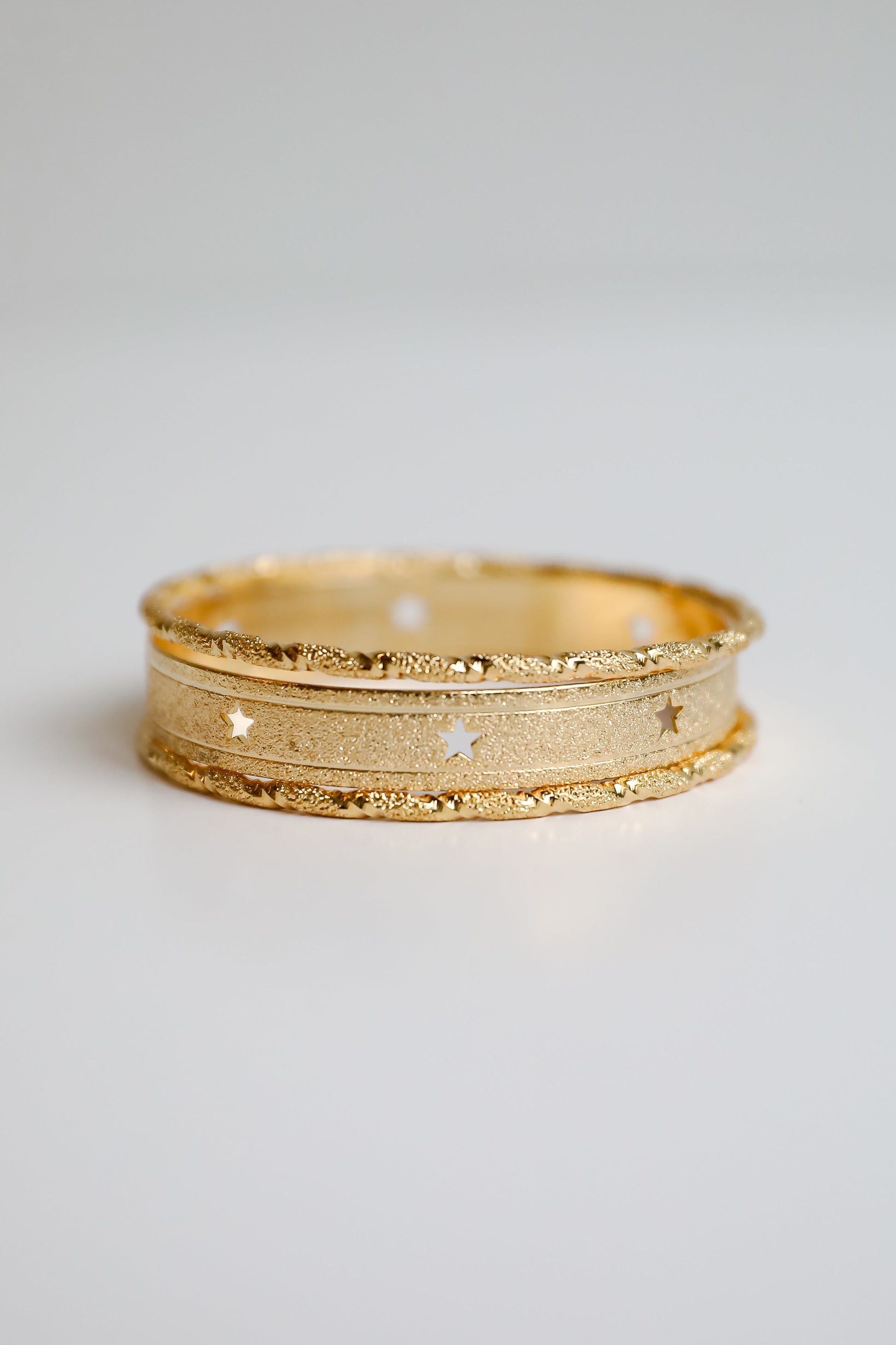 Your love for the Cecelia Gold Star Bangle Set will last forever! This set of three gold bracelets have a bangle design with star cutouts. Wear them all together. or separately. either way you'll love them!