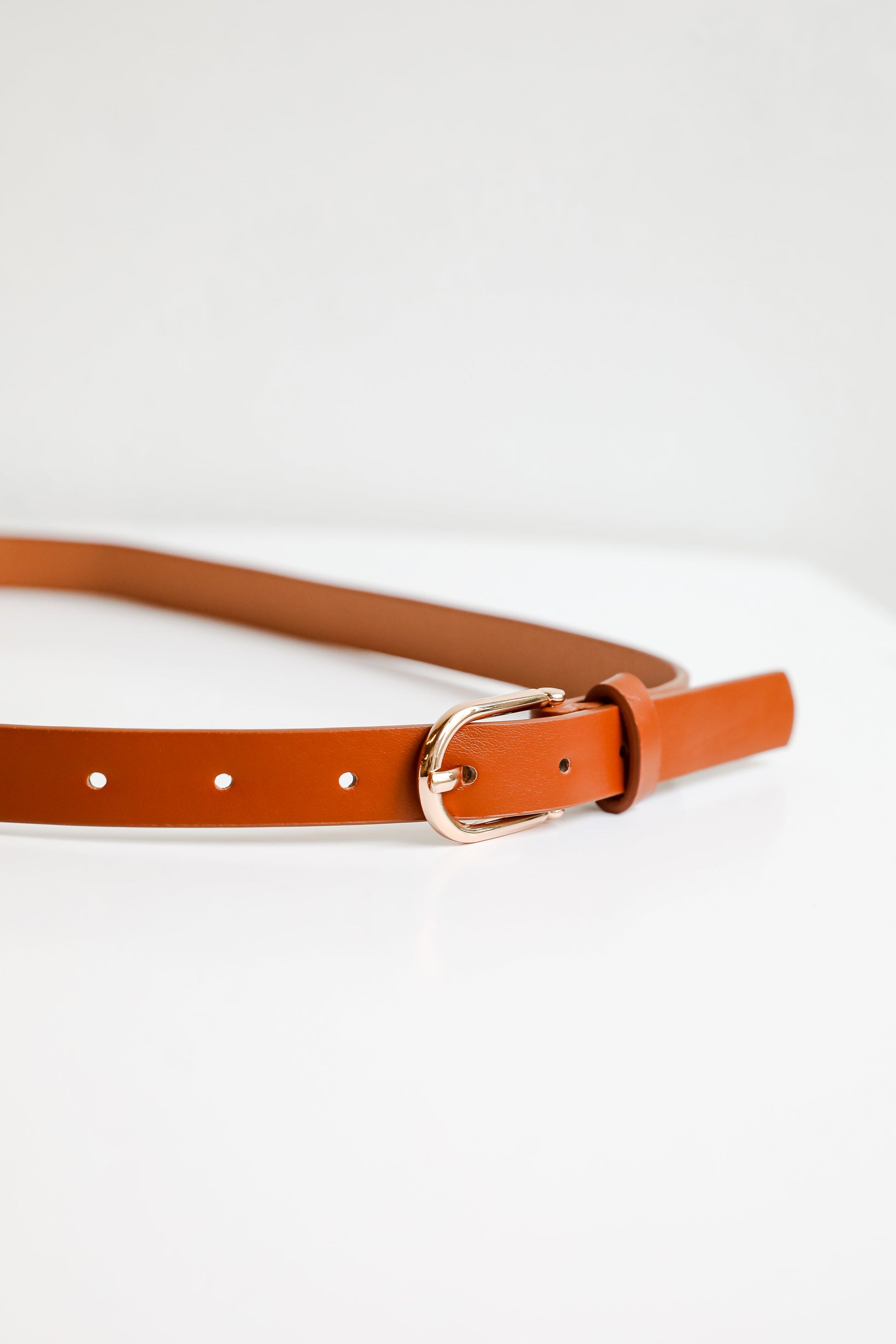 Give your look a major upgrade with the Chic Achievement Cognac Belt! This cute belt is designed with a vegan leather. It features a faux leather band and a gold buckle for closure! Complete every outfit from high-waisted denim and a bodysuit for a classic look to a show stopping silhouette with dressy jumpsuits!