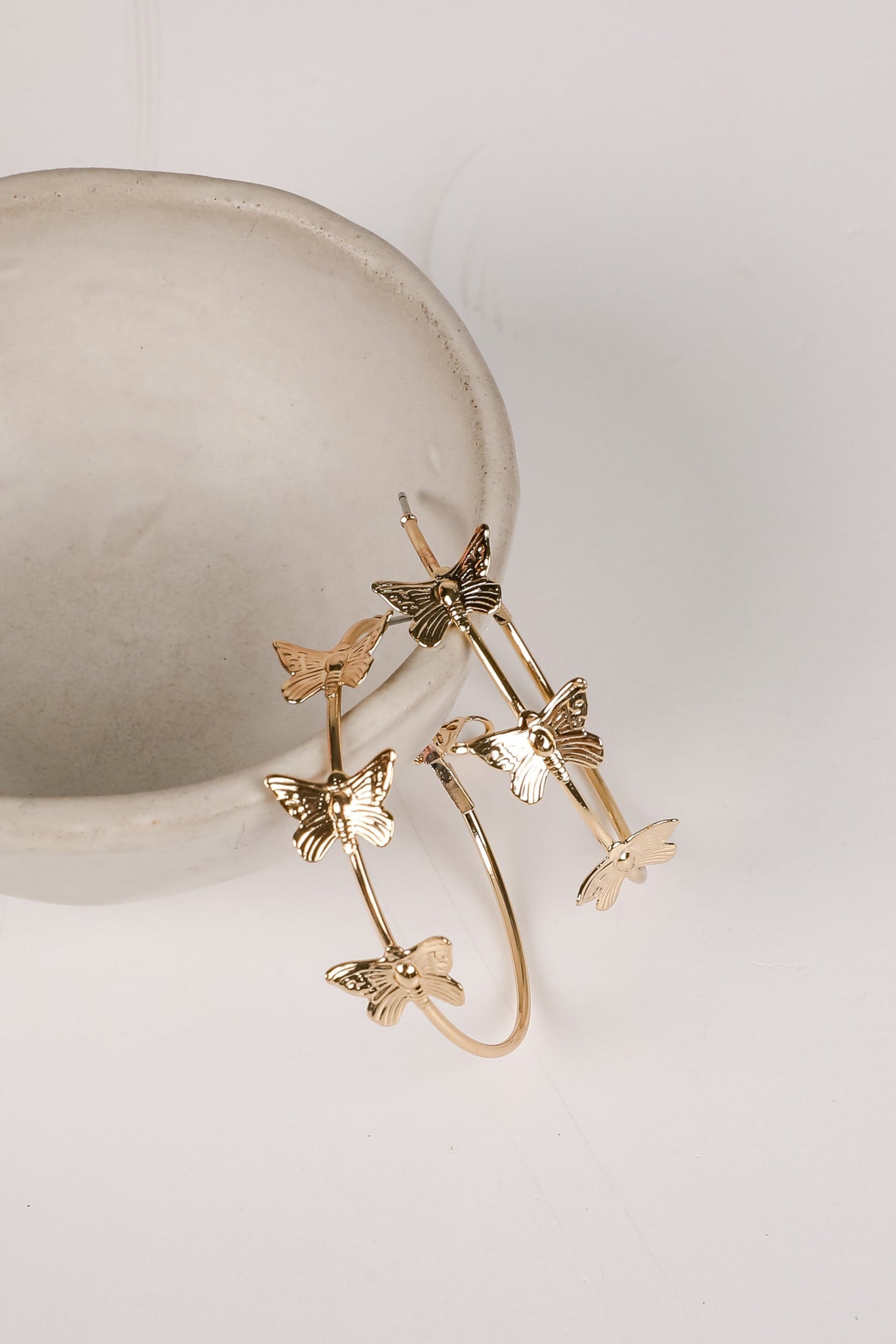 Create a luxe and eye-catching aesthetic with total ease thanks to the Juliette Gold Butterfly Hoop Earrings! These chic earrings feature a lever back with a hoop design with butterflies. Style the Juliette Earrings with anything from dresses to denim for an elevated look!