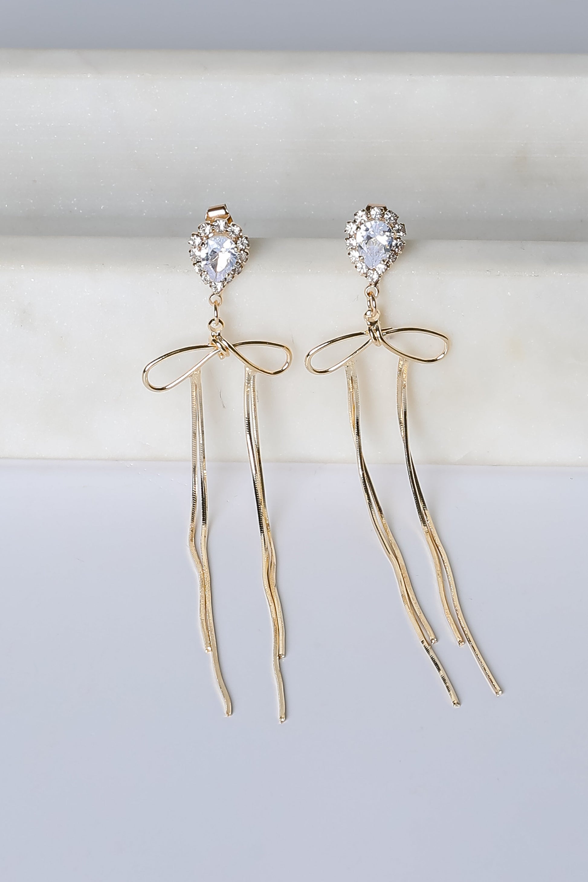 Lily Gold Rhinestone Bow Chain Drop Earrings