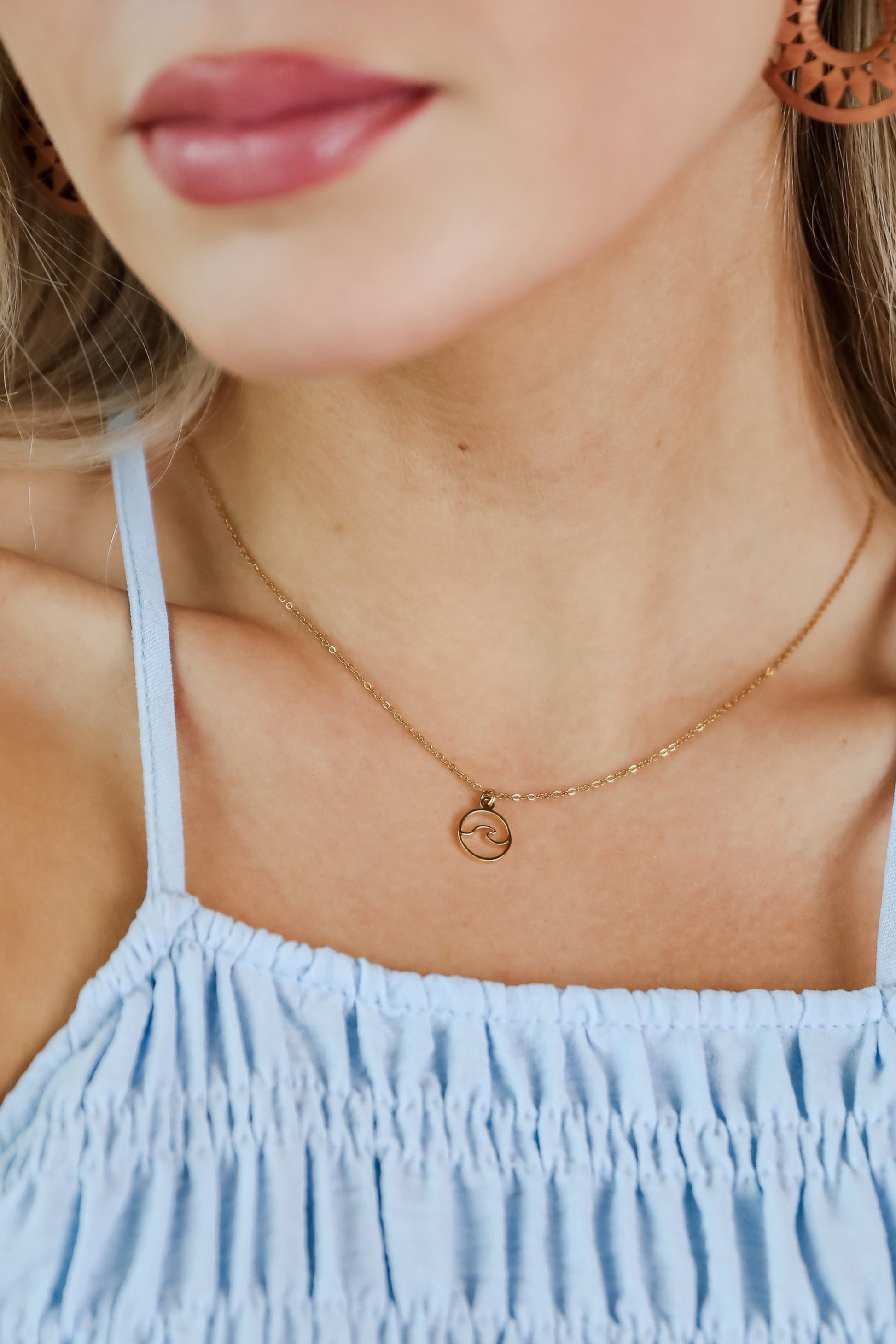 Catch everyone's attention every time you turn your head with the Melody Gold Wave Charm Necklace! This dainty necklace features a gold chain with a wave charm on the end. Style the Melody Necklace with any outfit to instantly upgrade your look!