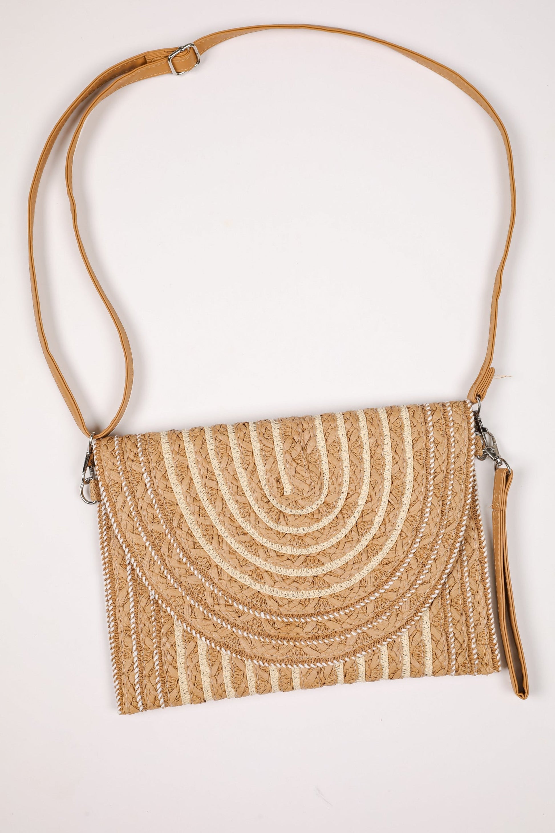 None of your resort 'fits would be complete without the No Need To Rush Tan Straw Clutch! This cute clutch is designed with a woven straw material. It features a wrist strap. a crossbody strap. a snap closure. and a lined interior. Style the No Need To Rush Tan Straw Clutch with any outfit to instantly add a beachy vibe to your outfit!
