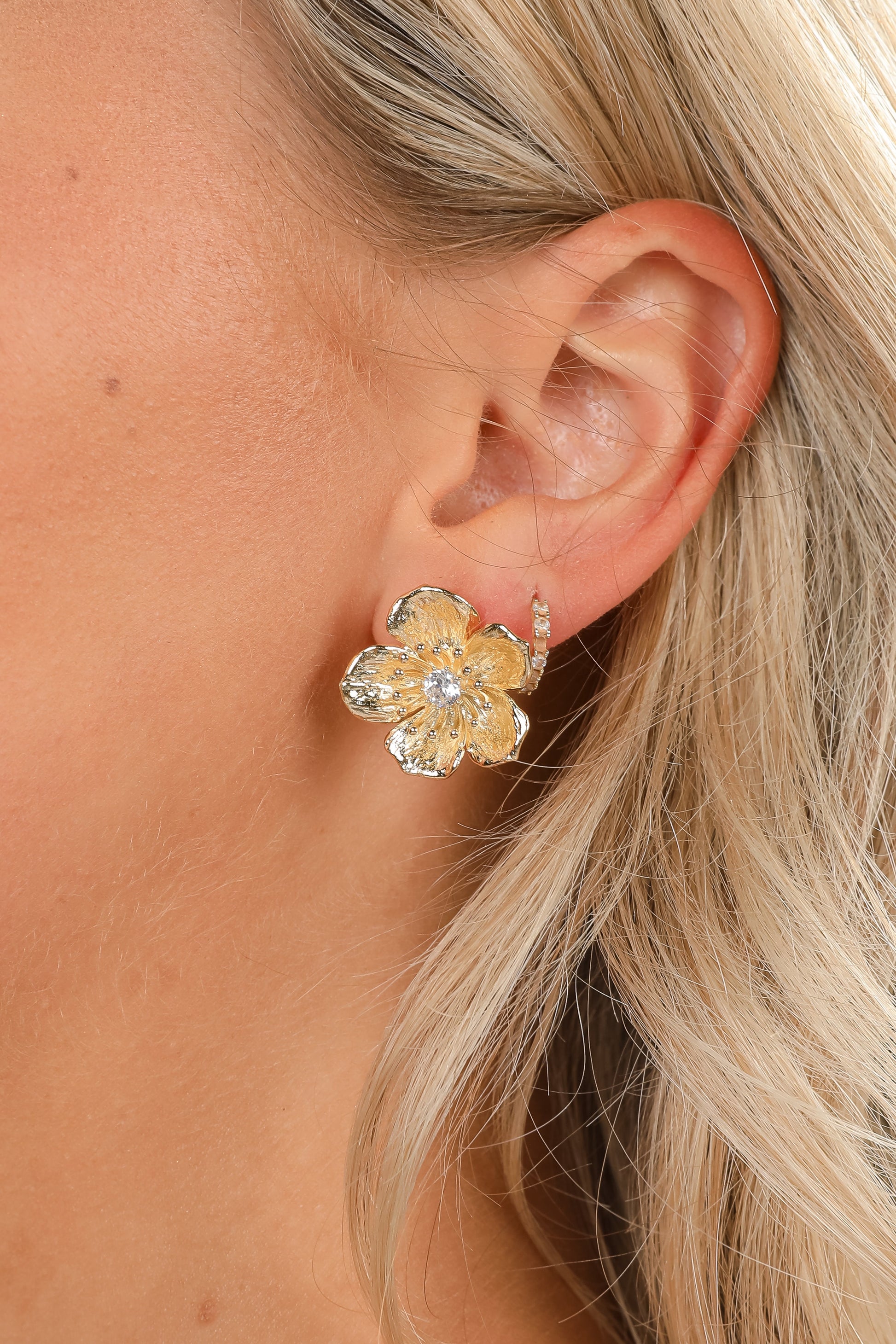 The Penelope Gold Flower Stud Earrings were made to a bring a simple yet sophisticated vibe to any look! These dainty earrings feature a flower shape & a rhinestone center with a stud post back! Style the Penelope Earrings with a mini dress + heels for a cute look!