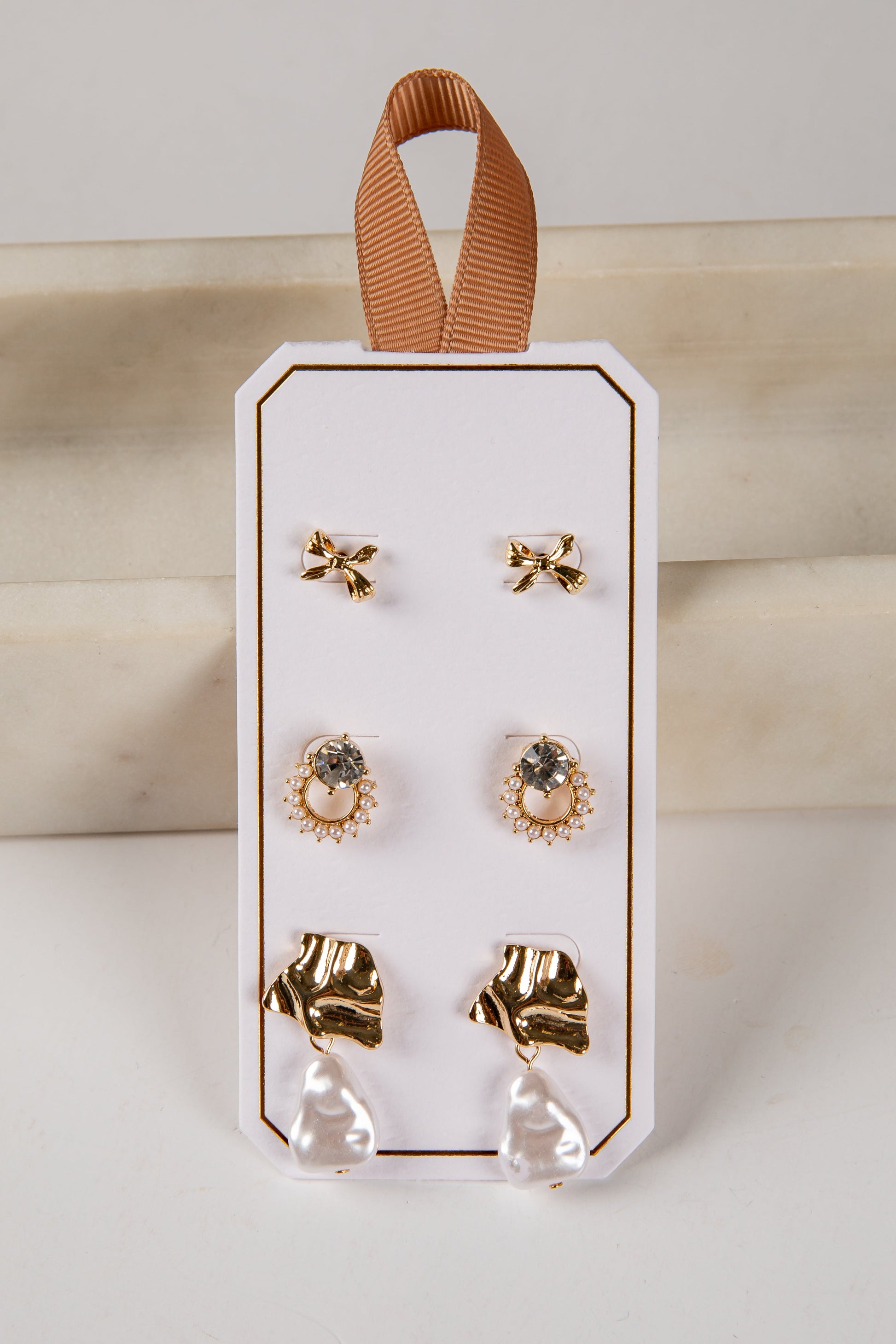 Whether they're the main accessory or a part of your carefully curated ear stack. the Reece Gold Earring Set is a classic must-have! This set of three pairs of earrings feature stud post backs with bows. pearls & rhinestones. Style the Reece Earrings with anything from dresses to graphic tees for a girly look!