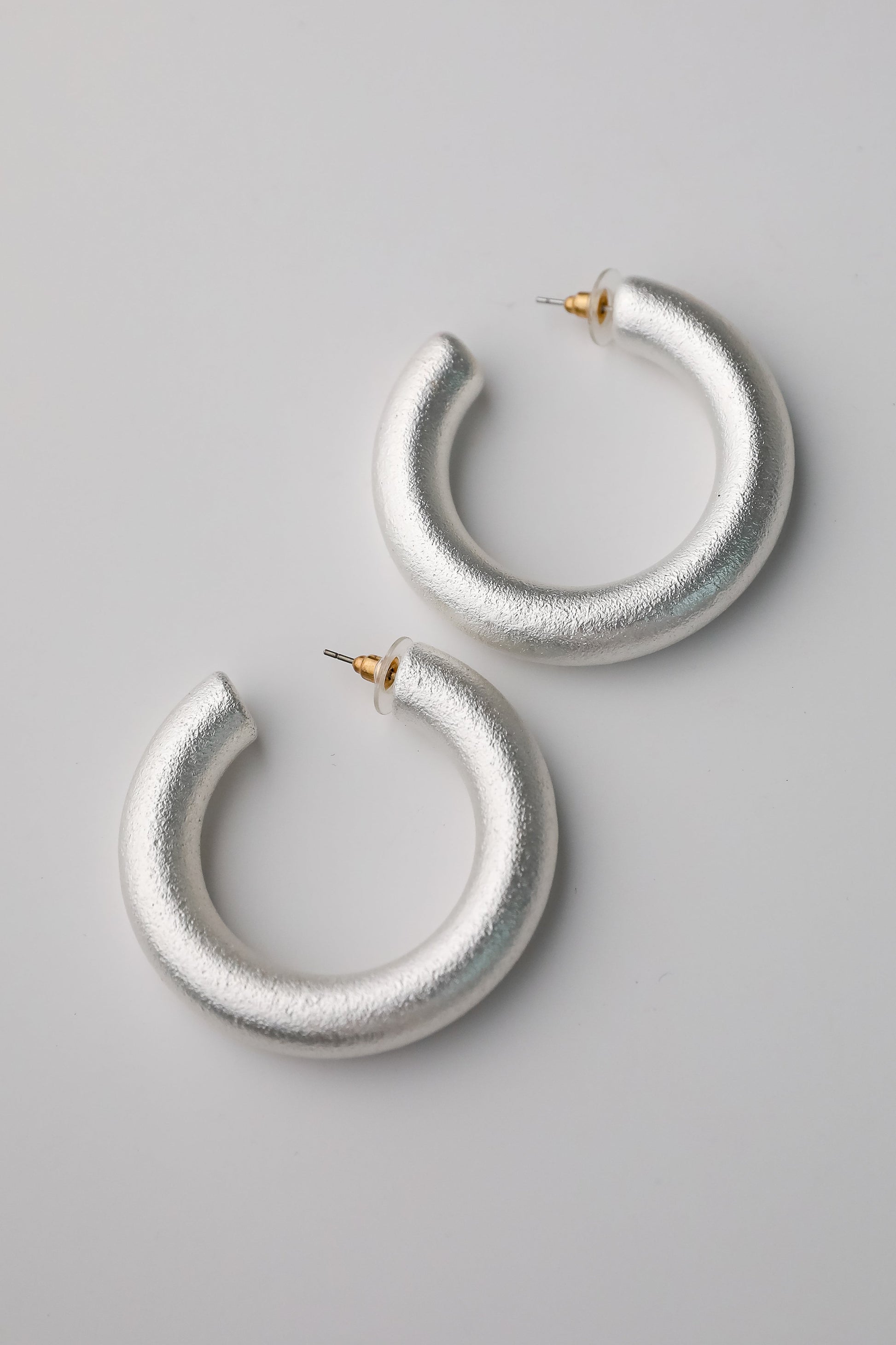 Grab your fave LBD and the Sabrina Silver Hoop Earrings and you're ready to go! These trendy earrings feature a thick hoop shape with a stud post back! Style the Sabrina Earrings with a mini dress + heels for a chic look!