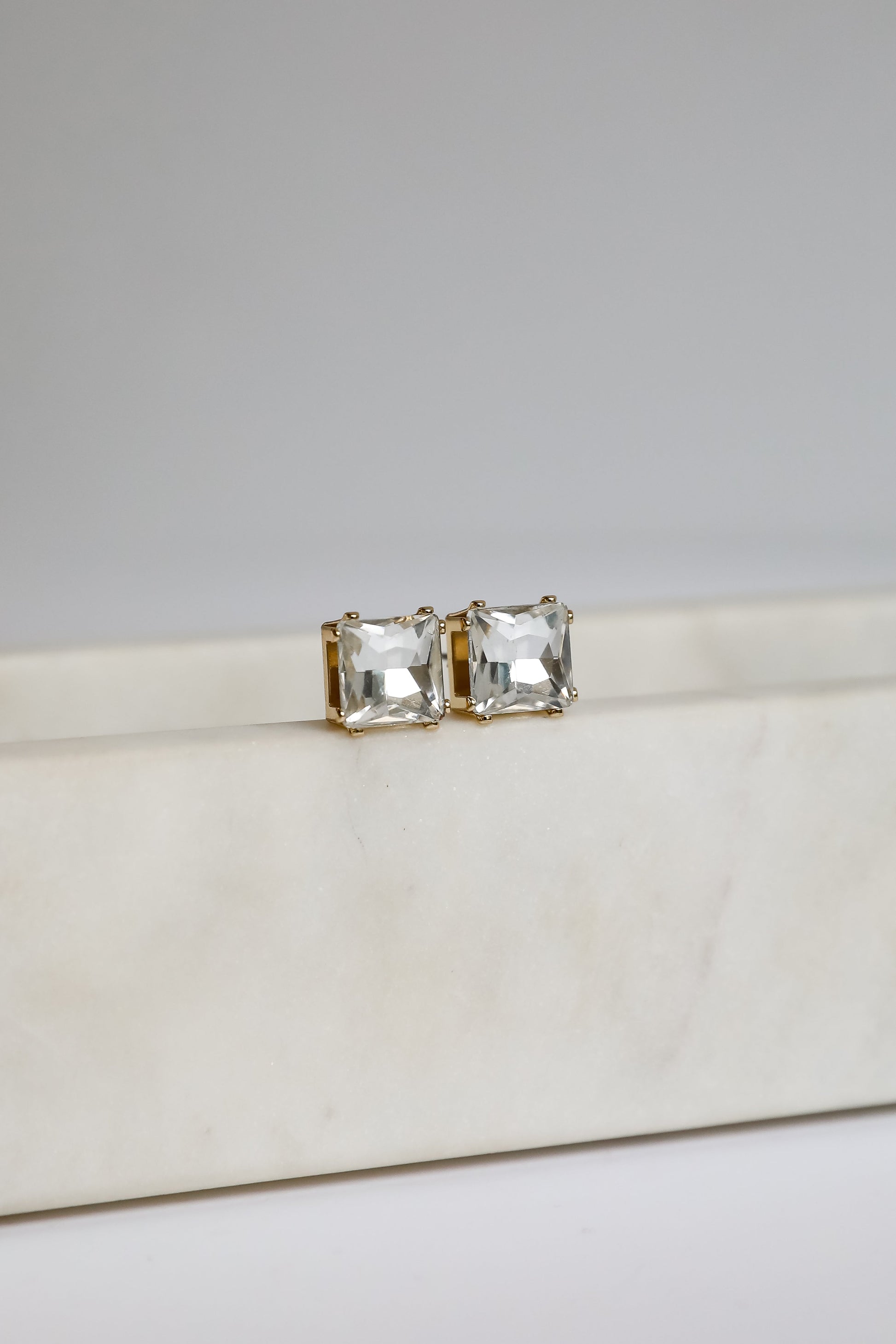 The Selena Clear Gemstone Stud Earrings are here to amp up your attitude! These dainty earrings feature a square shape with clear gemstones & a stud post back! Style the Selena Earrings with a mini dress + heels for a cute look!