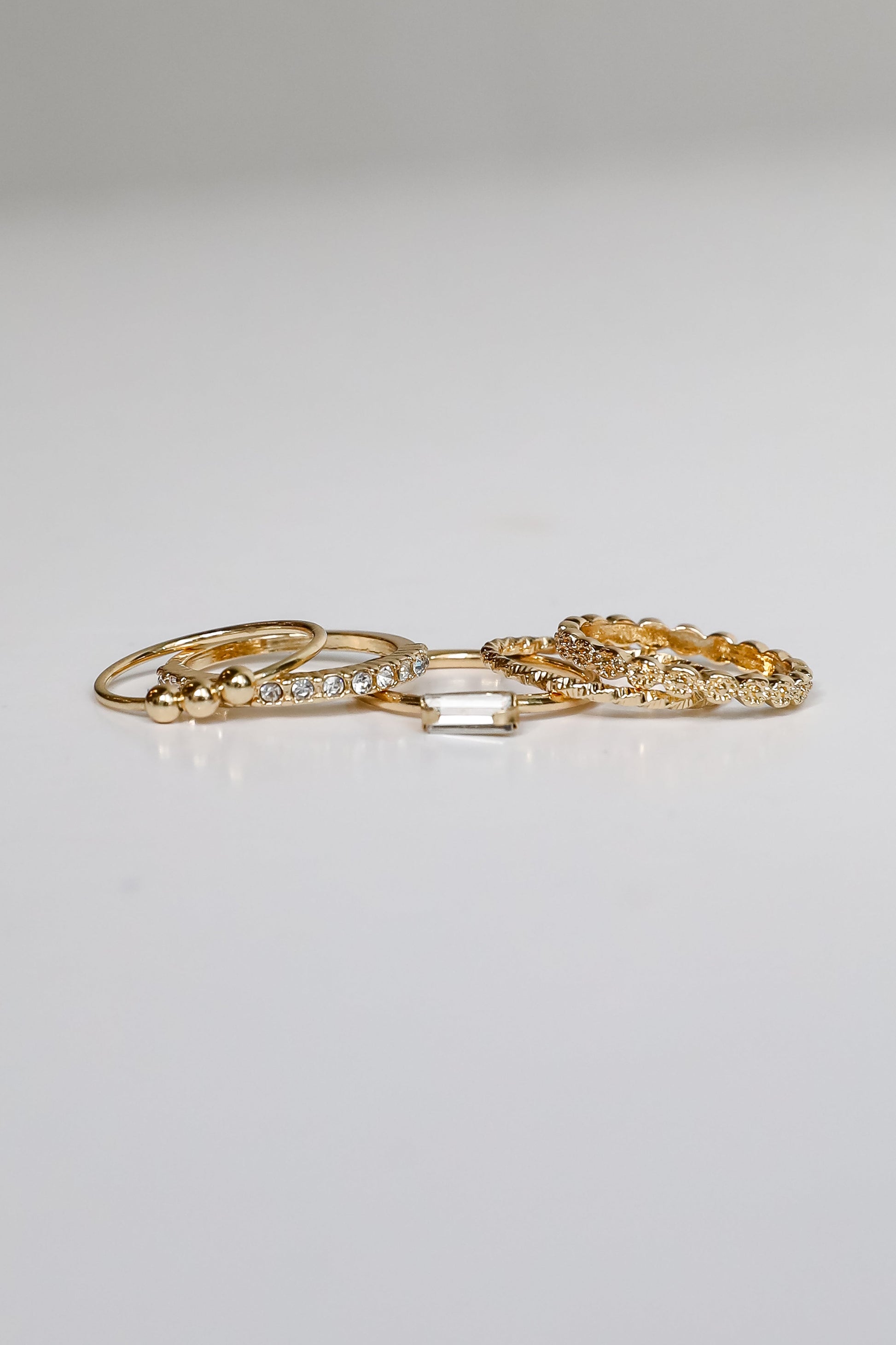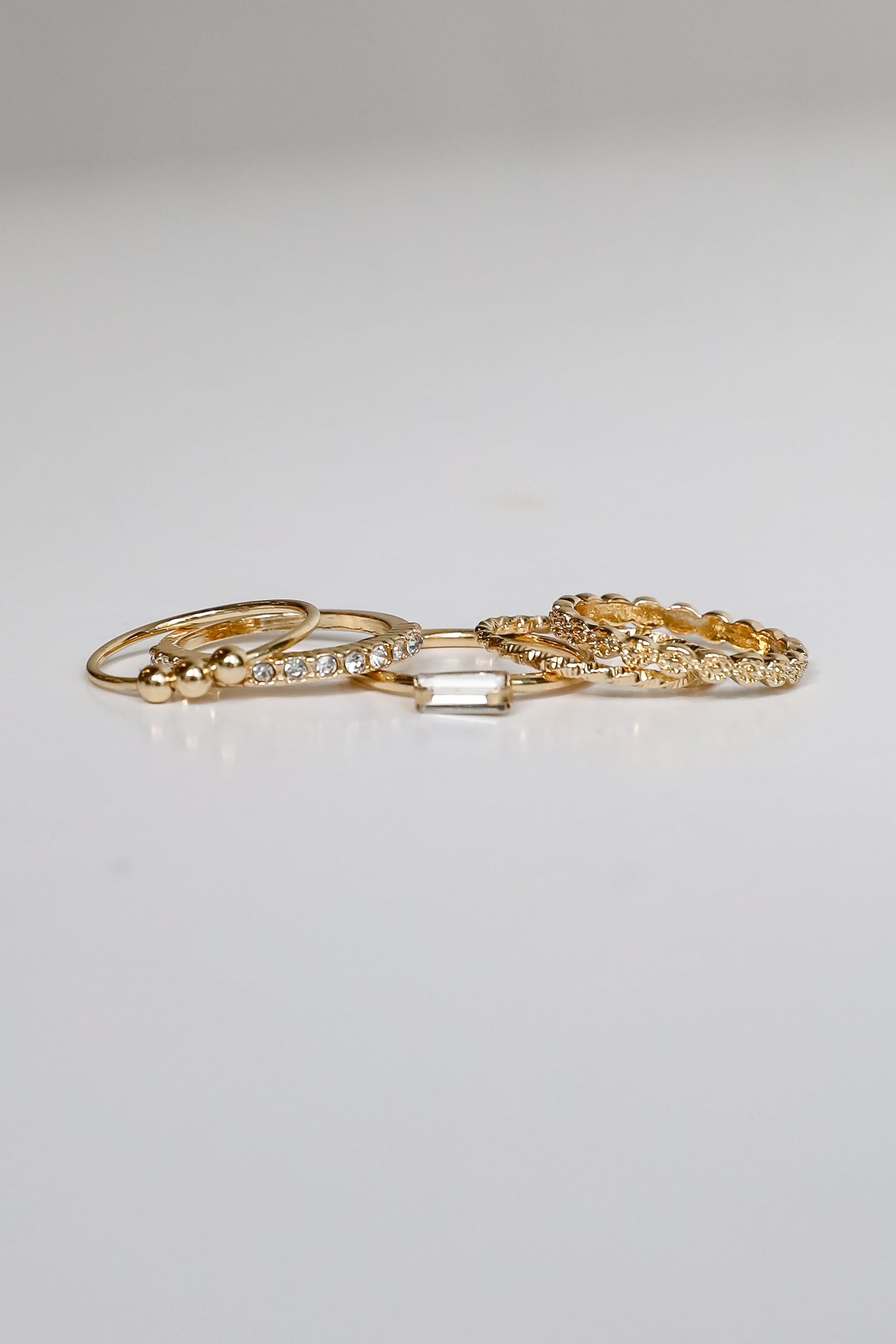 Devout yourself to looking on trend every time you style the Willow Gold Ring Set! This set of five dainty gold rings feature varying shapes and textures with rhinestones. Wear the Willow Rings separately or stack them all together. either way you'll love them!